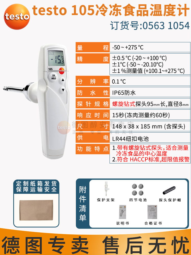 1 个 testo 105 手持式温度计,带有冷冻食品测量头,包括腰带/墙面支架和电池。