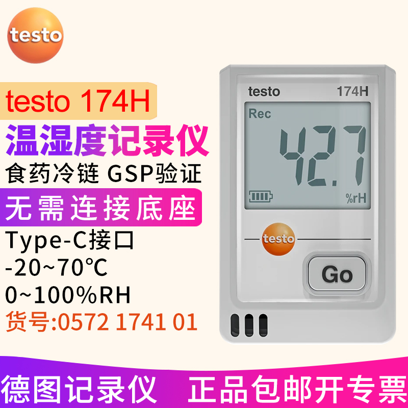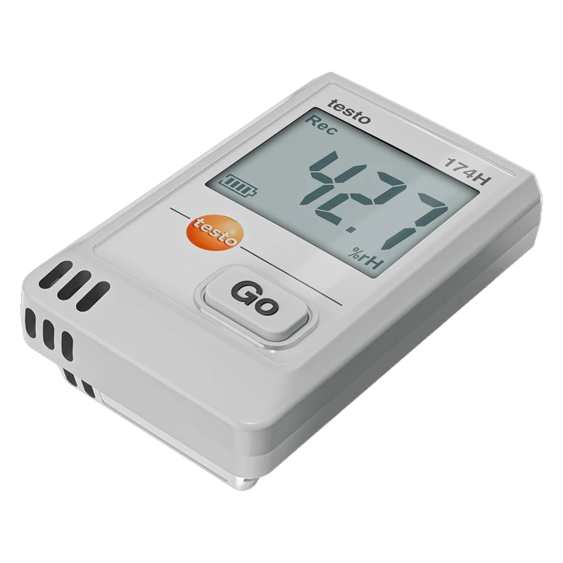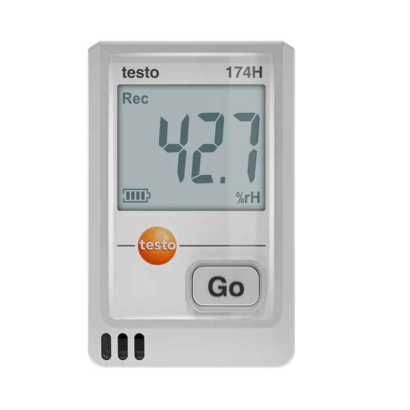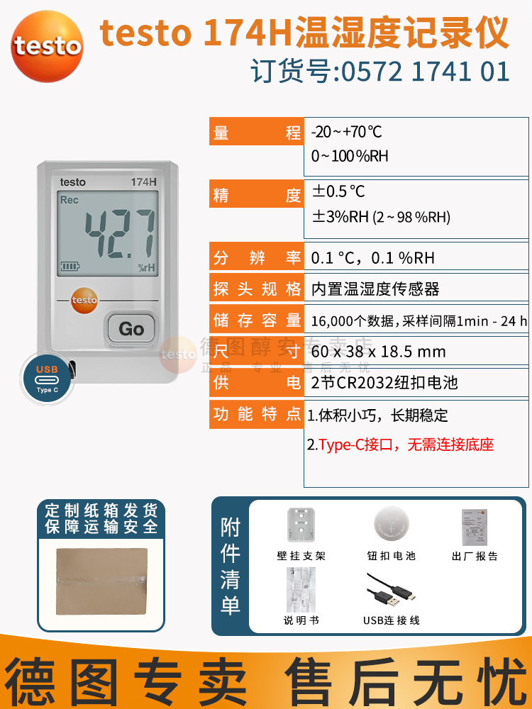 testo 174 H 迷你型温度数据记录仪,包括墙壁支架、电池(2 x CR2032 锂电池)、USB 2.0 数据线、出厂报告。