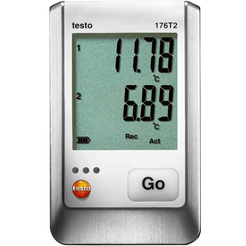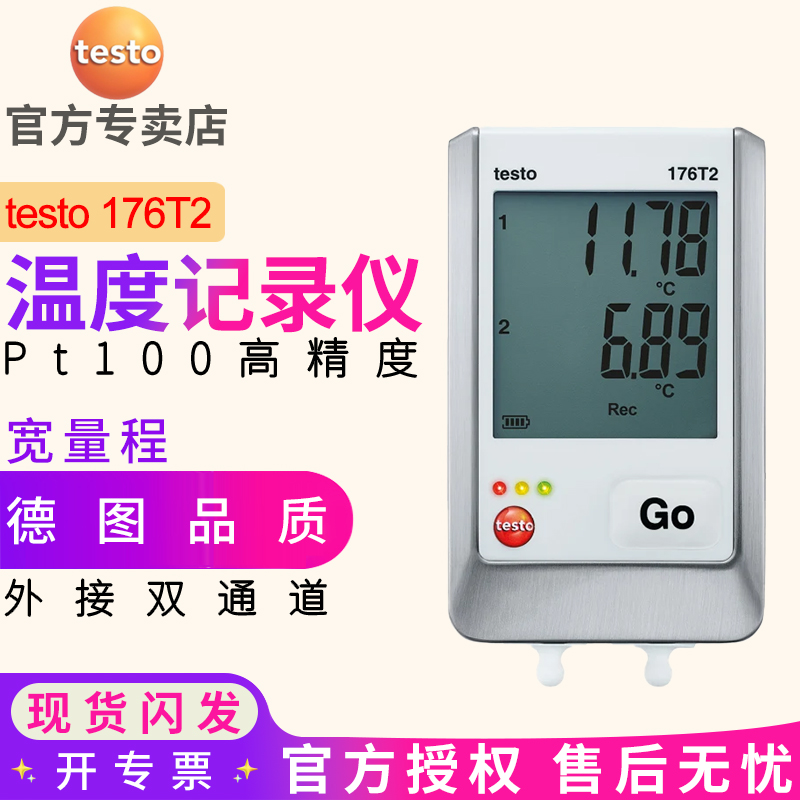 testo 176 T2温度记录仪特别适用于双通道温度监控,可同时连接2个Pt100温度探头,探头类型根据您的需要请从我们提供的选配列表中自行选择。因此可同时监测2个不同测量点的温度值,并且如有需要可直接通过记录仪的显示屏进行查看2个测量点的温差。该温度数据记录仪可进行长期温度监控 (无需频繁读取数据),testo 176 T2配备超大容量内存,可存储多达2百万组数据,电池寿命长达8年。