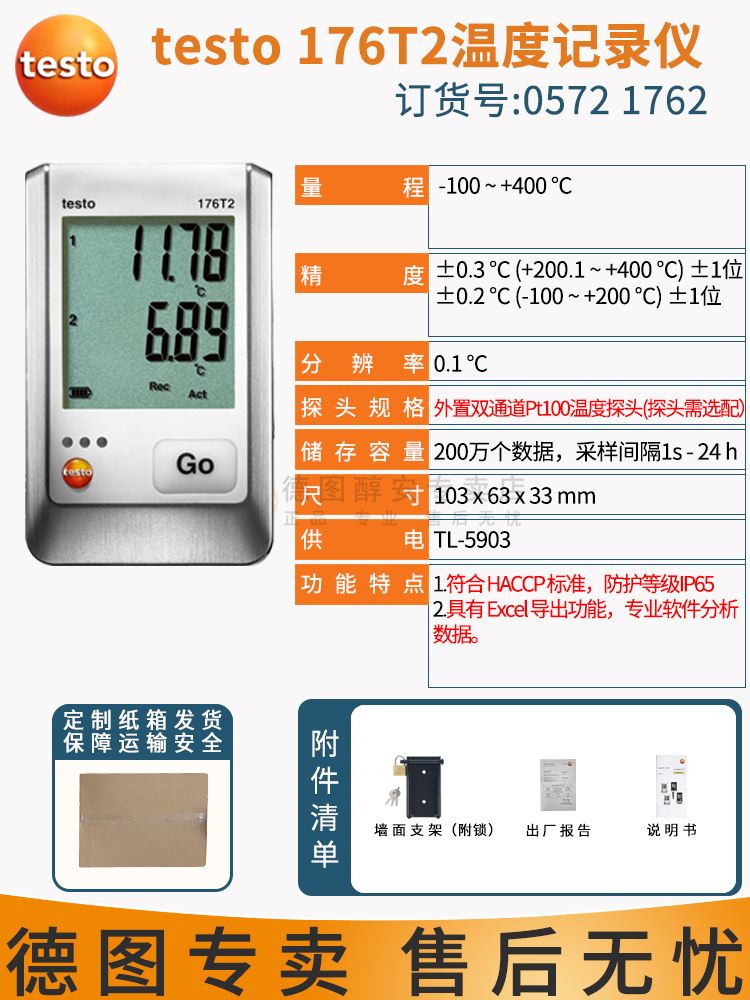 testo 176 T2 电子温度记录仪,带两个外置Pt100温度探头接口,包括墙面安装支架,支架专用锁,电池和出厂报告。